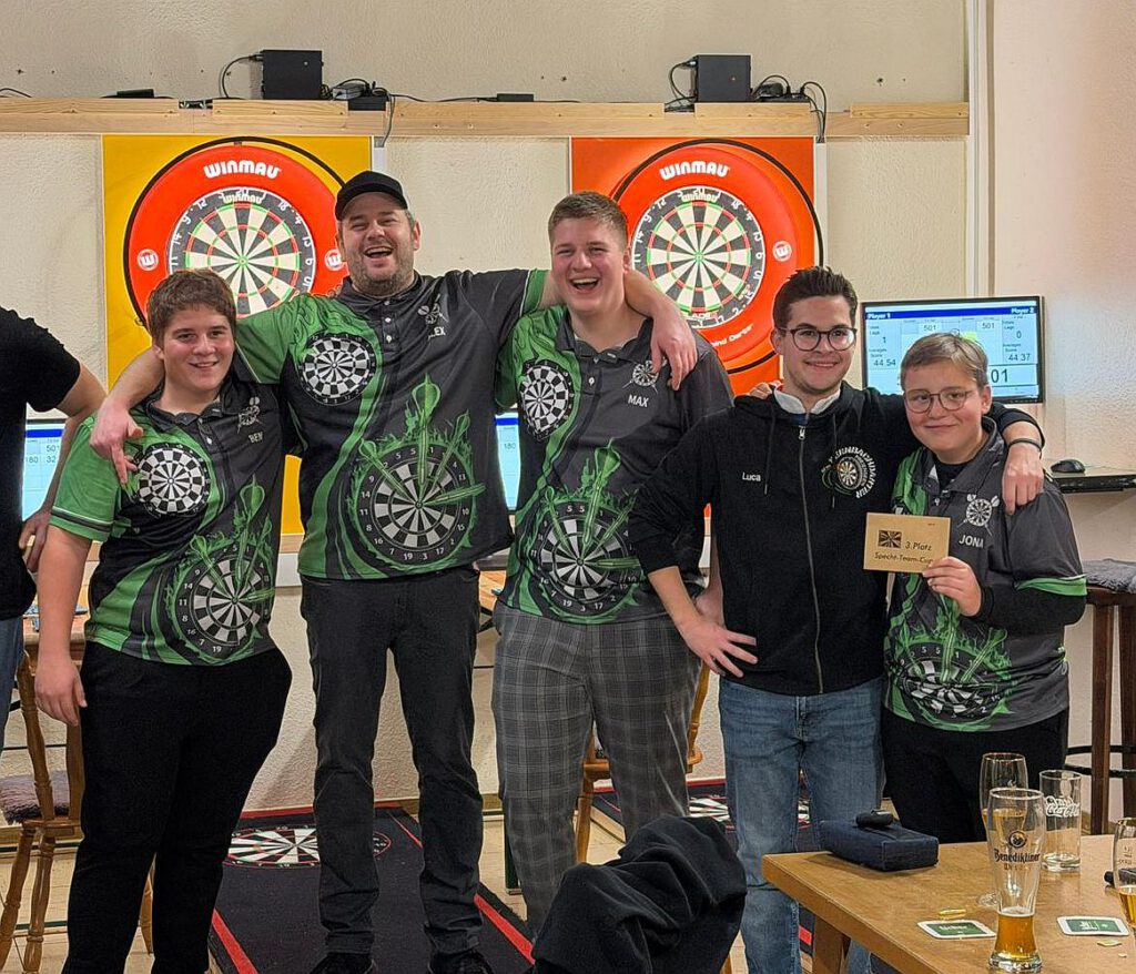 Den 3. Platz belegten die Ocherbachdarter durch einen 3:0-Sieg im kleinen Finale gegen das Team der Mighty Mosquitos. Auf dem Foto des dritten Teams der Seenbachdarter sind von links nach rechts zu sehen: Benjamin Hübner, Alexander Hahn, Maximilian Hübner, Luca Slapa sowie Jonathan Hübner.
